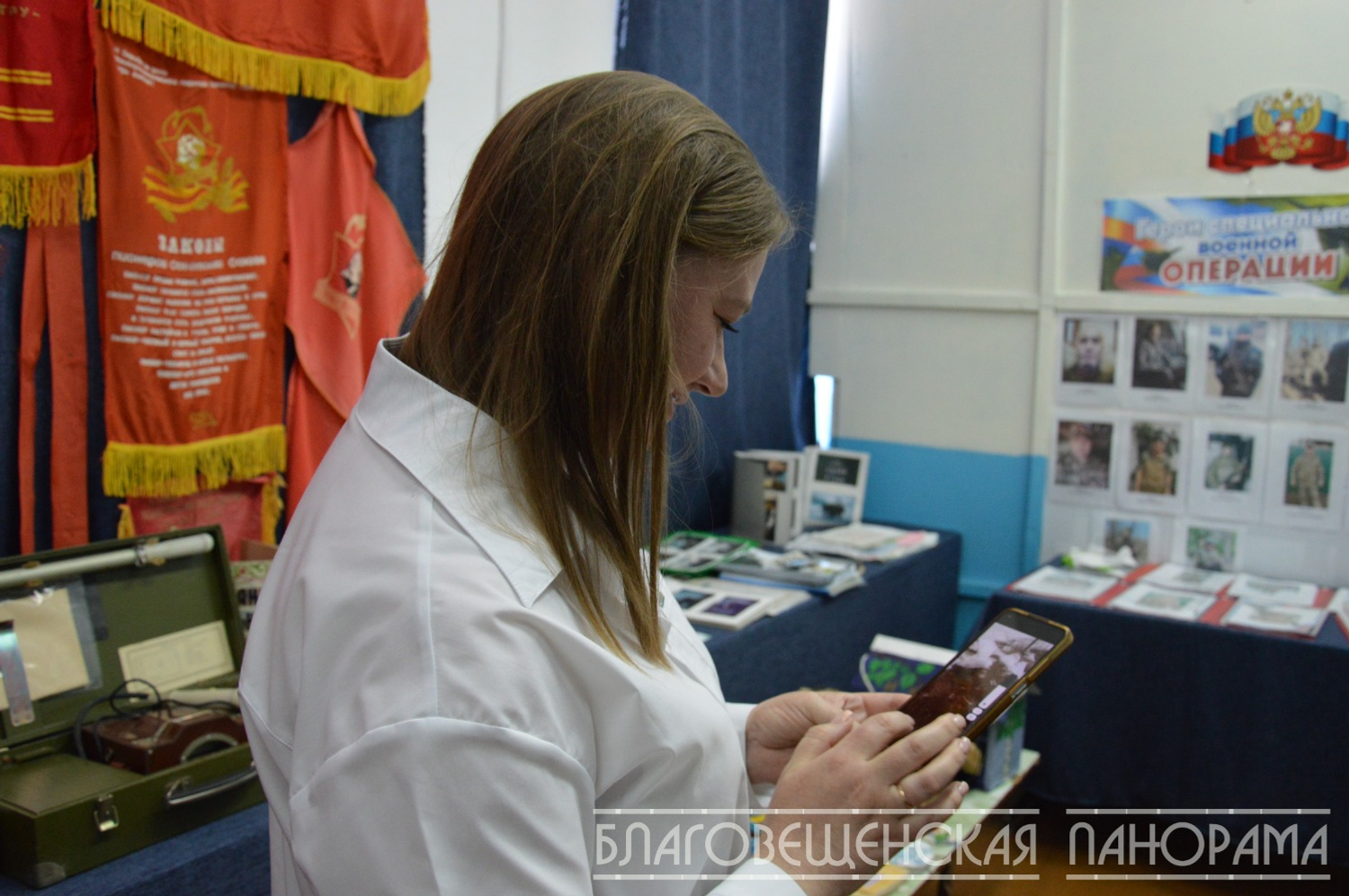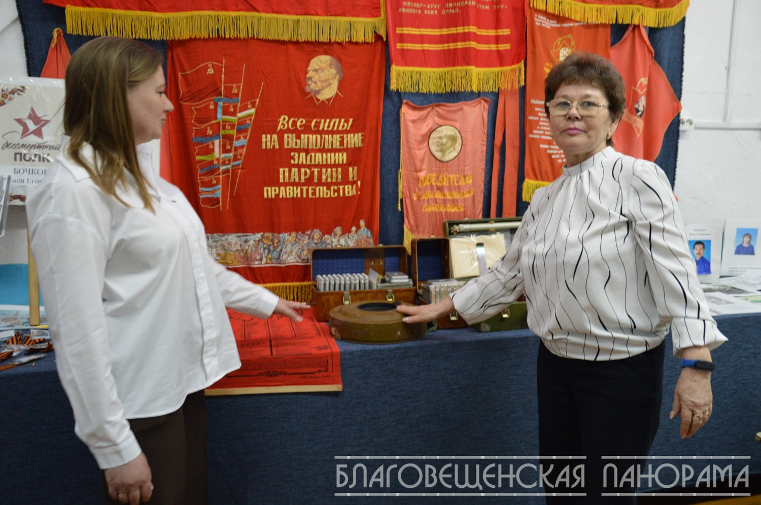 - В 2023 году сделали музей истории нашего сельсовета и памяти героев войны и спецоперации. Всё собирали по крупицам. Даже из бывшей оружейной комнаты взяли предметы. Всё отмыли и отстирали. Ирина Вервельская подарила нам вот этот материал на скатерти, - рассказывает Марина Александровна.