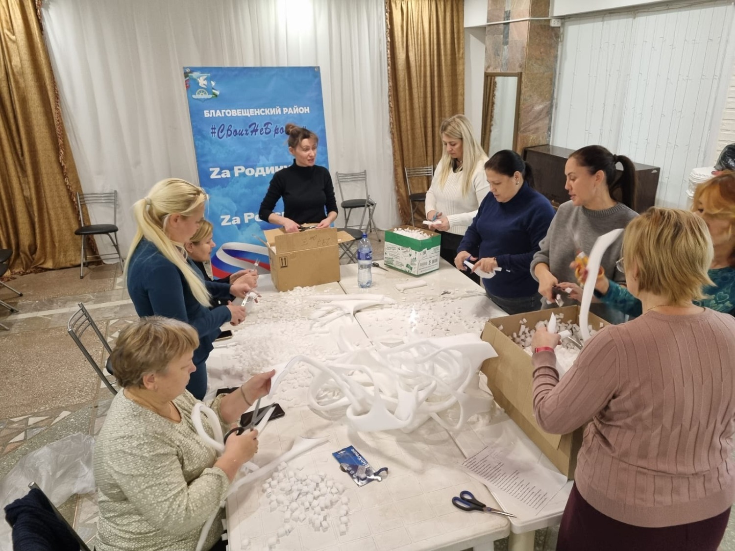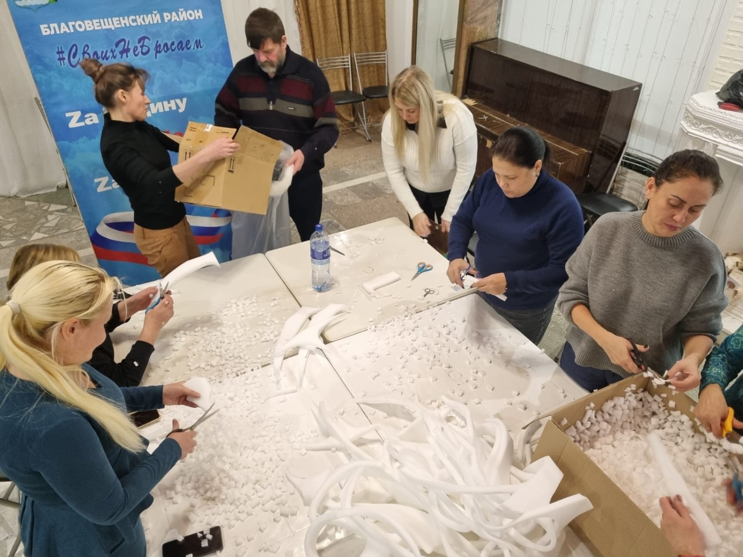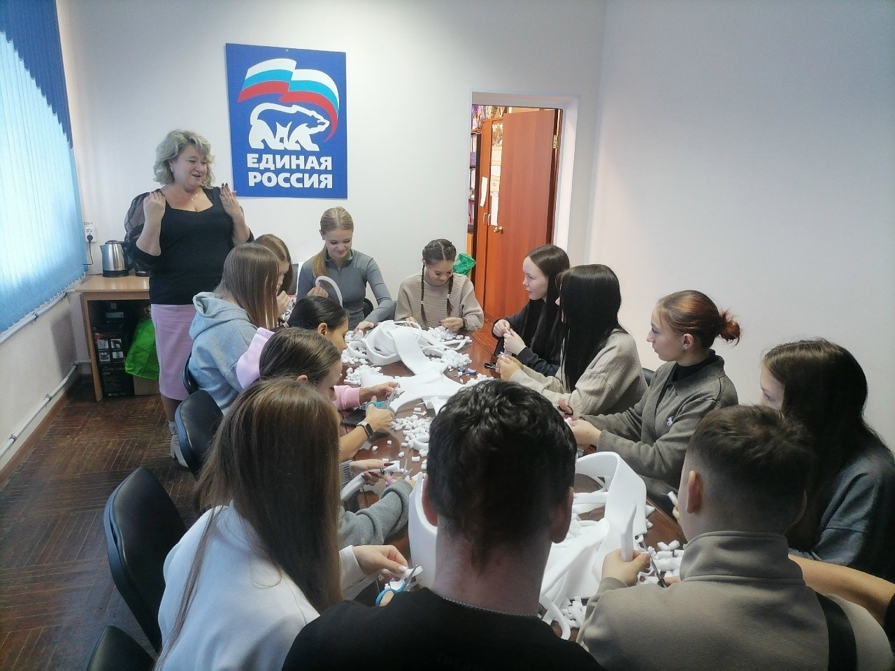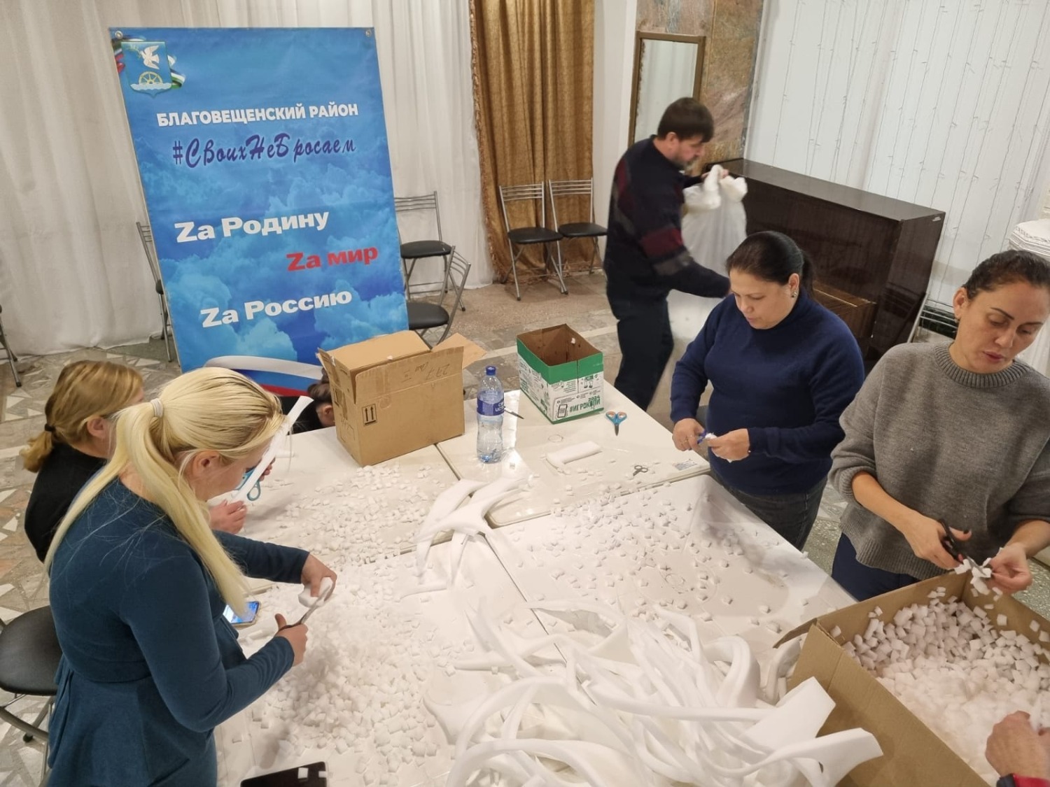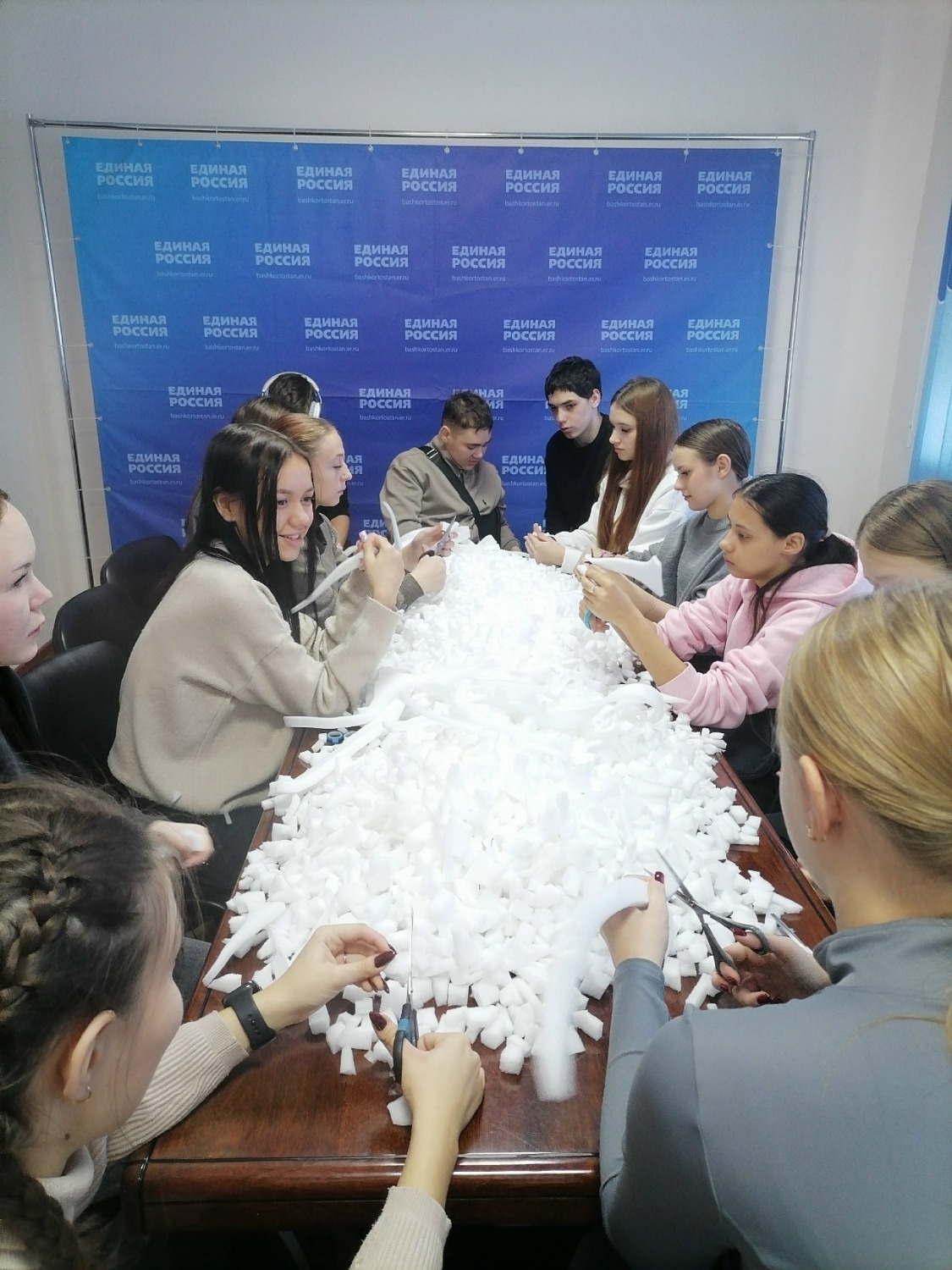 В течения дня здесь кипела работа. Нарезали поролон на мелкие фракции представители партийного актива «Единой России».