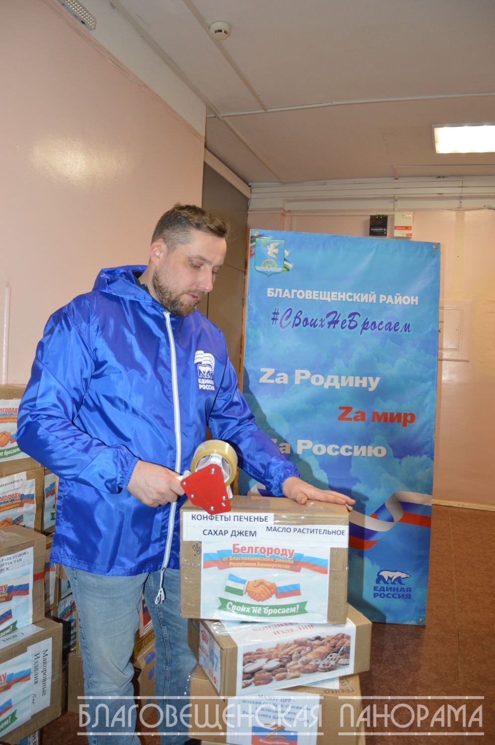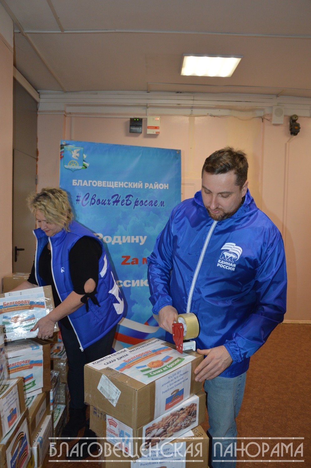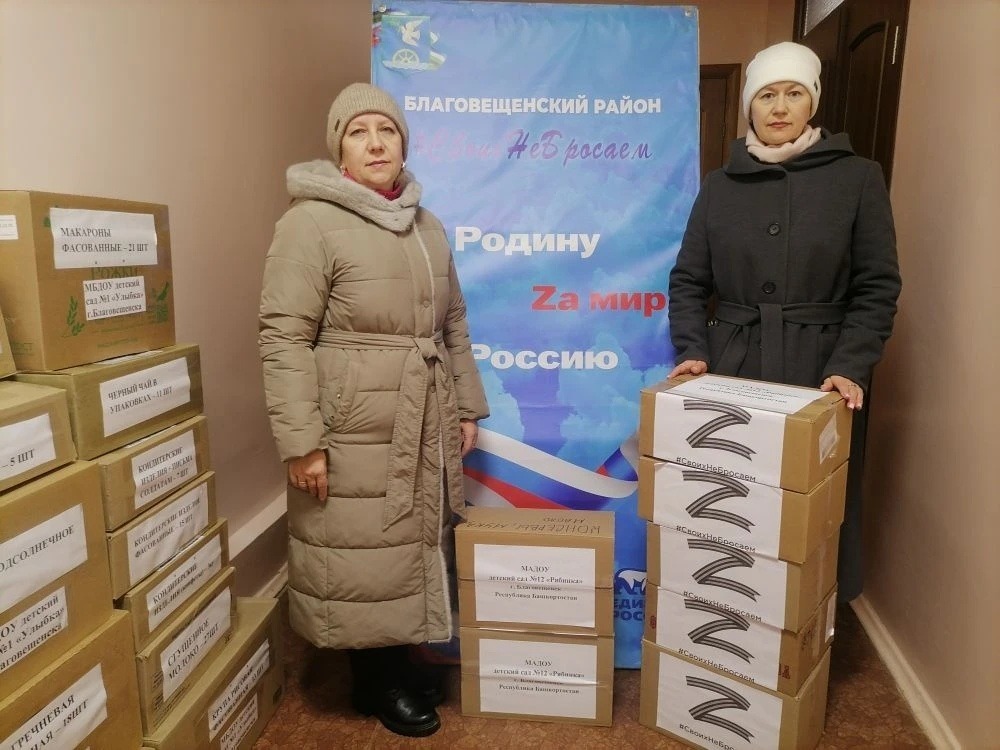 Вчера этот бесценный груз, тщательно упакованный заботливыми руками, отправился в путь. Его повезли в Единый логистический центр в Уфе депутаты районного совета Евгения Березина и Альберт Кашапов. А помогали им в погрузке неутомимые волонтёры, в том числе студенты Благовещенского многопрофильного колледжа.