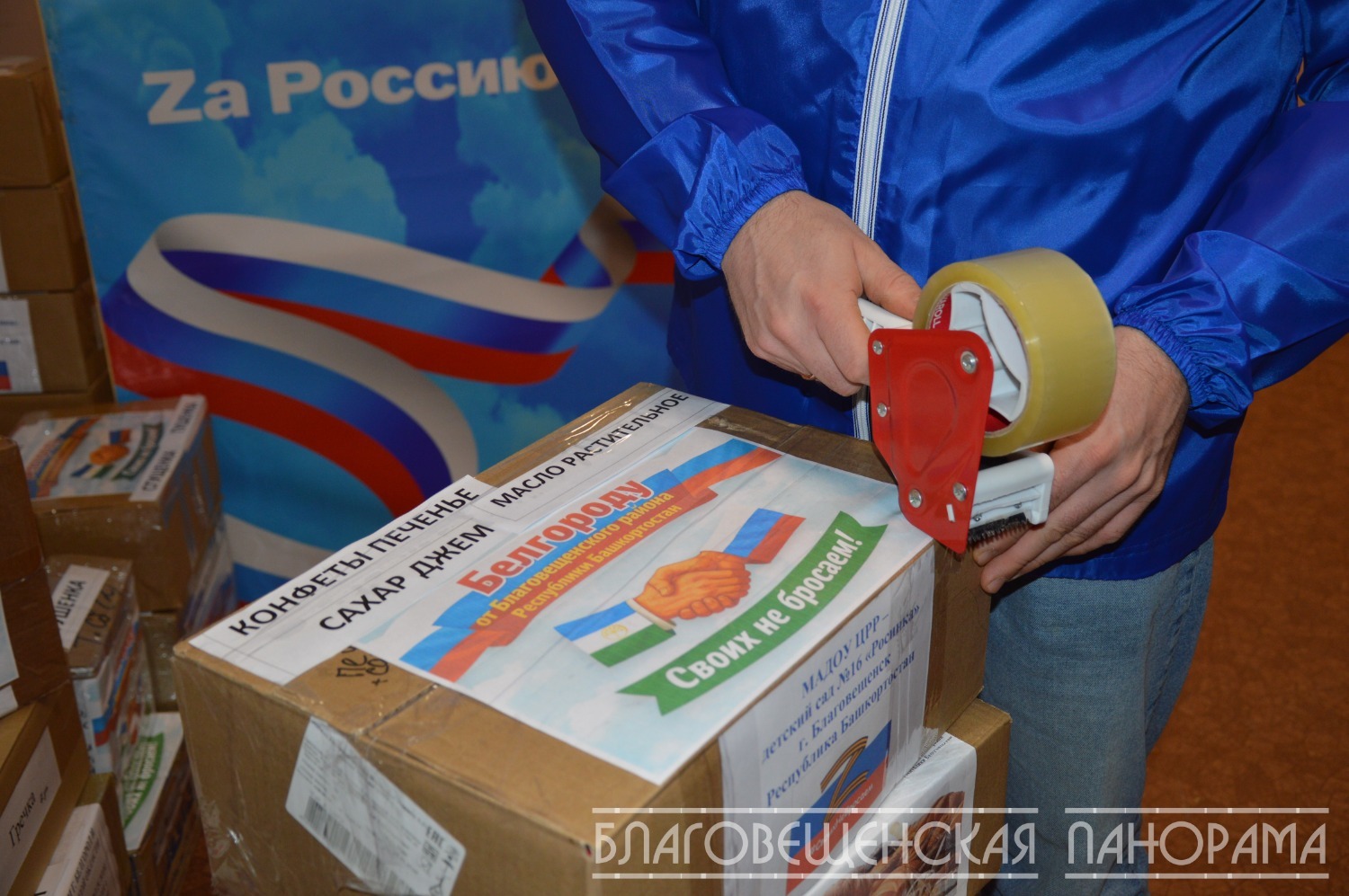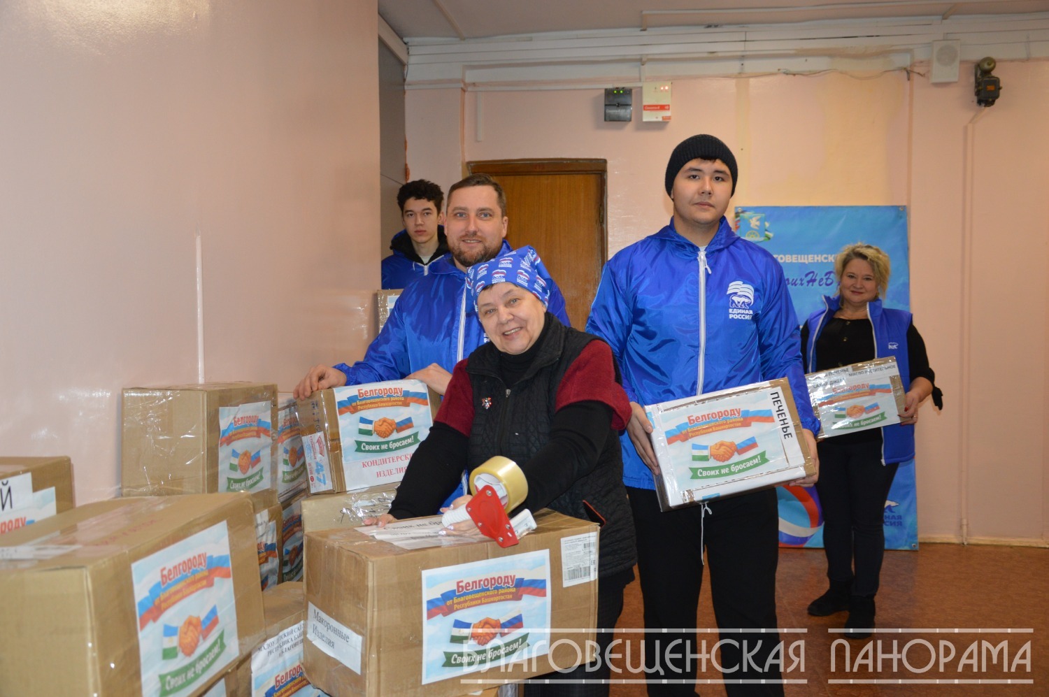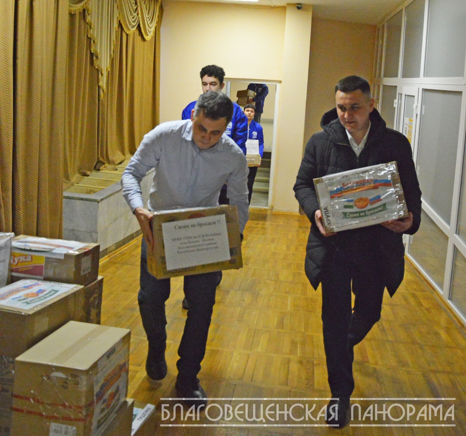 Вчера этот бесценный груз, тщательно упакованный заботливыми руками, отправился в путь. Его повезли в Единый логистический центр в Уфе депутаты районного совета Евгения Березина и Альберт Кашапов. А помогали им в погрузке неутомимые волонтёры, в том числе студенты Благовещенского многопрофильного колледжа.